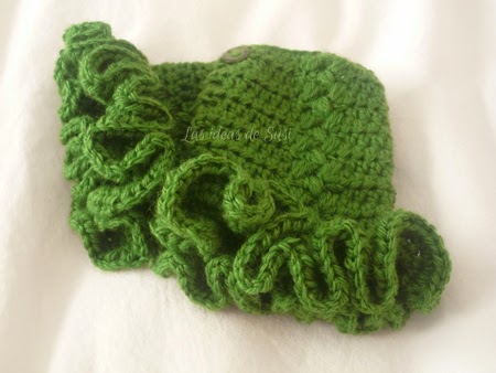 Estos mitones están hechos con punto medio alto, o media vareta; y punto piña para hacer los dibujos. Se rematan con unos volantes; y unos botones sirven de cierre en la muñeca.